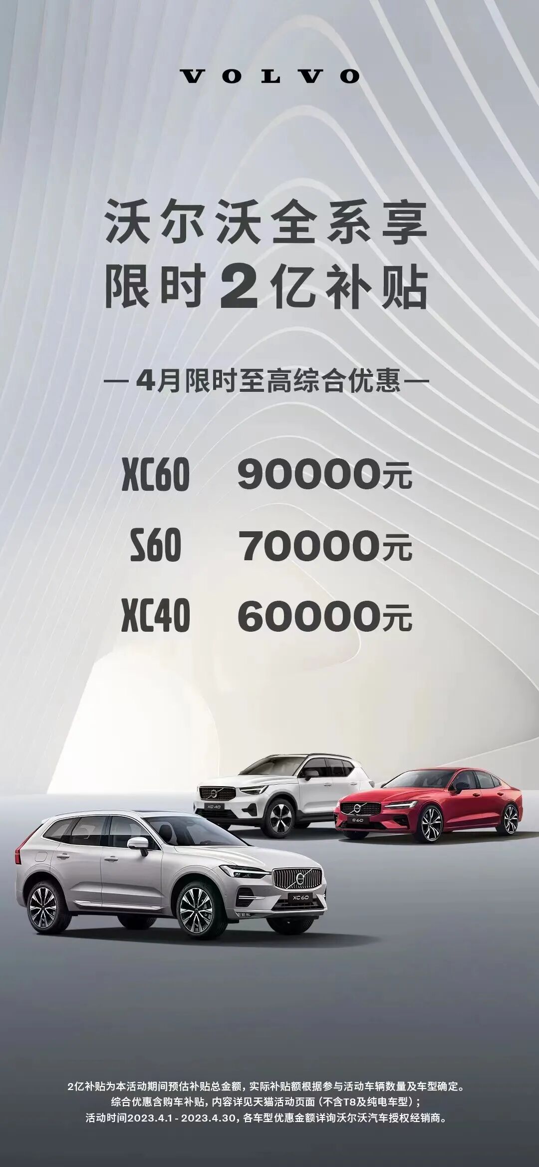 沃尔沃全系享2亿补贴,4月限时至高综合优惠XC40 60000元 S60 70000元 XC60 90000元