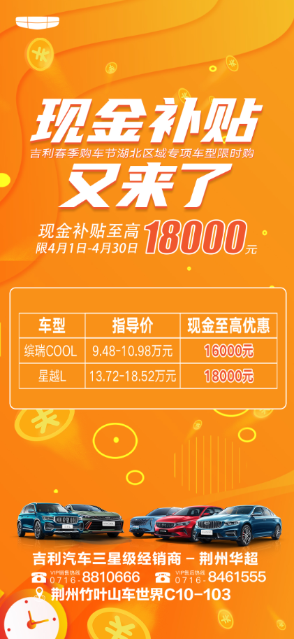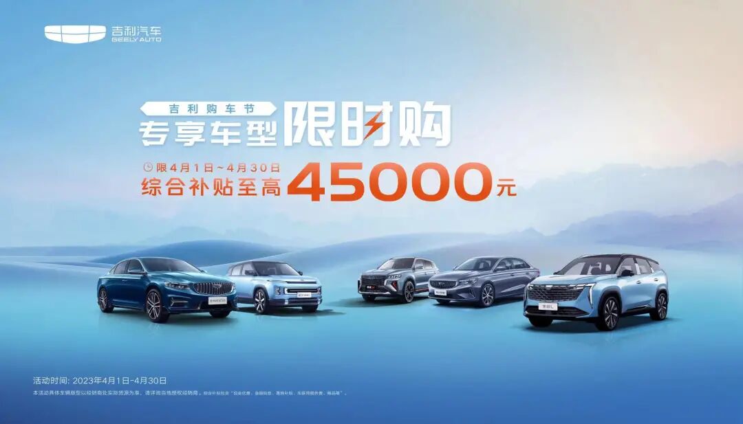 吉利购车节,专享车型限时购,至高综合补贴45000元,现金至高优惠15000元,一张身份证,当日提车。
