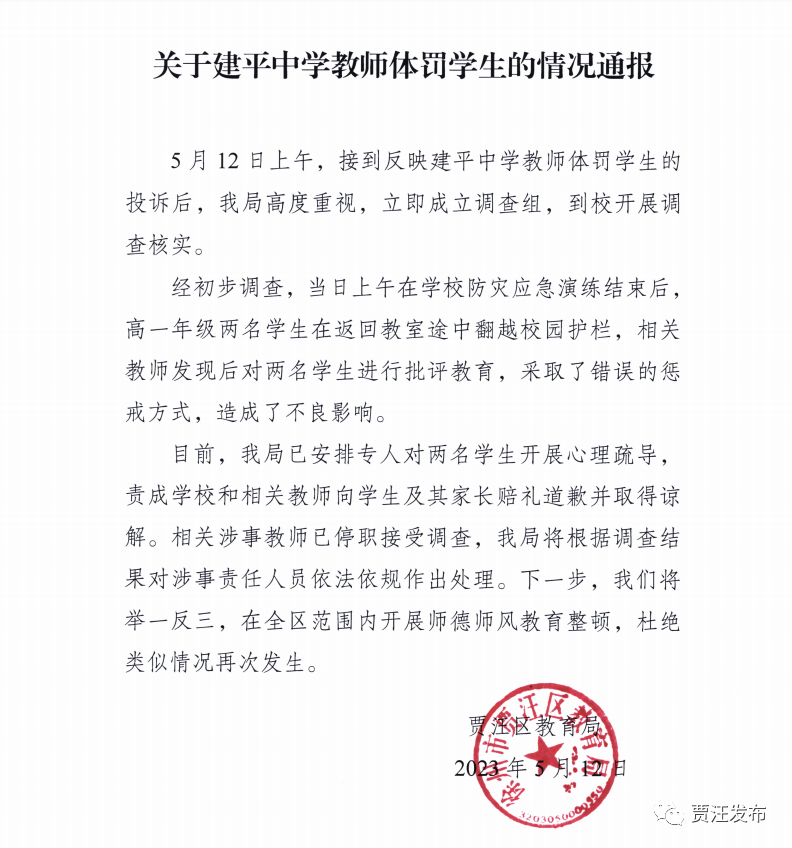 5月12日,一则“老师让学生在操场跪地爬行”的视频在网络流传。 当日16时28分,江苏徐州市贾汪区教育局发布通报称,相关涉事教师已停职接受调查。 通报称,5月12日上午,接到反映建平中学教师体罚学生的投诉后,该局高度重视,立即成立调查组,到校开展调查核实。 经初步调查,当日上午在学校防灾应急演练结束后, 高一年级两名学生在返回教室途中翻越校园护栏,相关教师发现后对两名学生进行批评教育,采取了错误的惩戒方式,造成了不良影响。 目前,该局已安排专人对两名学生开展心理疏导,责成 学校和相关教师向学生及其家长赔礼道歉并取得谅解。相关涉事教师已 停职接受调查,该局将根据调查结果对涉事责任人员依法依规作出处理。 下一步,将举一反三,在全区范围内开展师德师风教育整顿,杜绝类似情况再次发生。 来源/贾汪发布、南方都市报编辑/张晋滨 责编/彭梦迪 审核/王海安 乞峰 大家都在看 请点赞点在看↓↓↓
