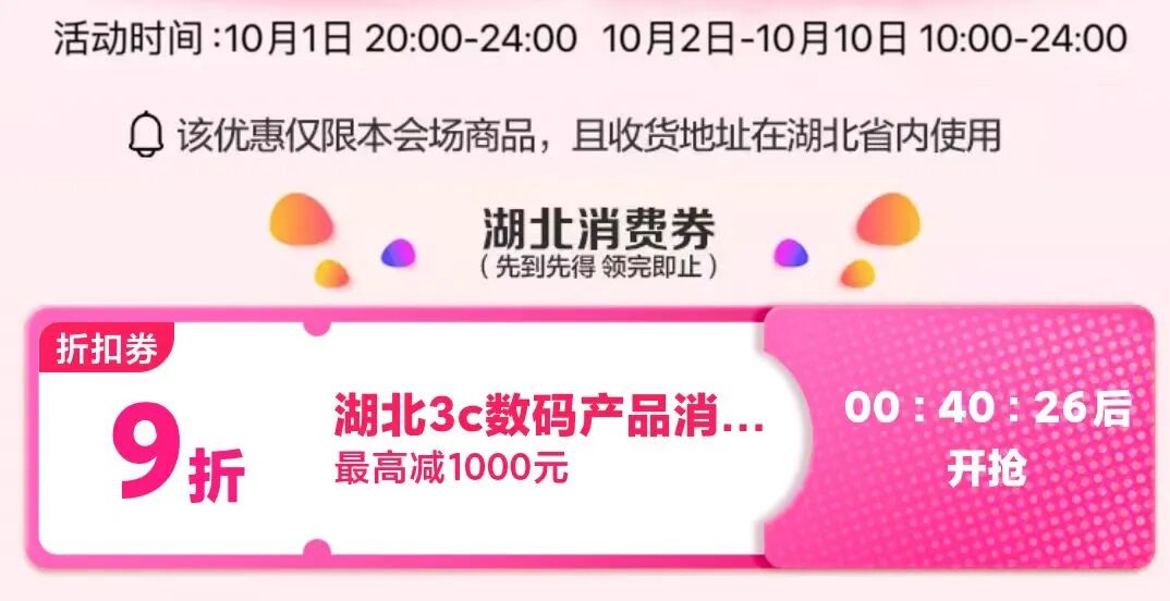 10月2日后每日领取、使用时间为10:00-24:00。线下3C数码产品消费券每日领取、使用时间为10:00-21:00。