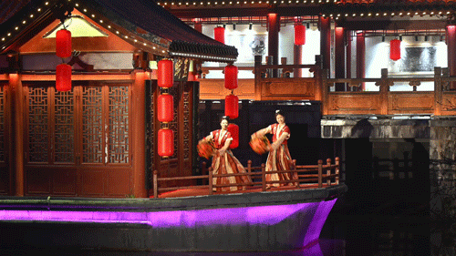 除了灯光秀和烟花,今年依旧能欣赏到游船上的古风舞蹈。小桥流水,画舫徐徐,古人的审美情趣瞬间get。