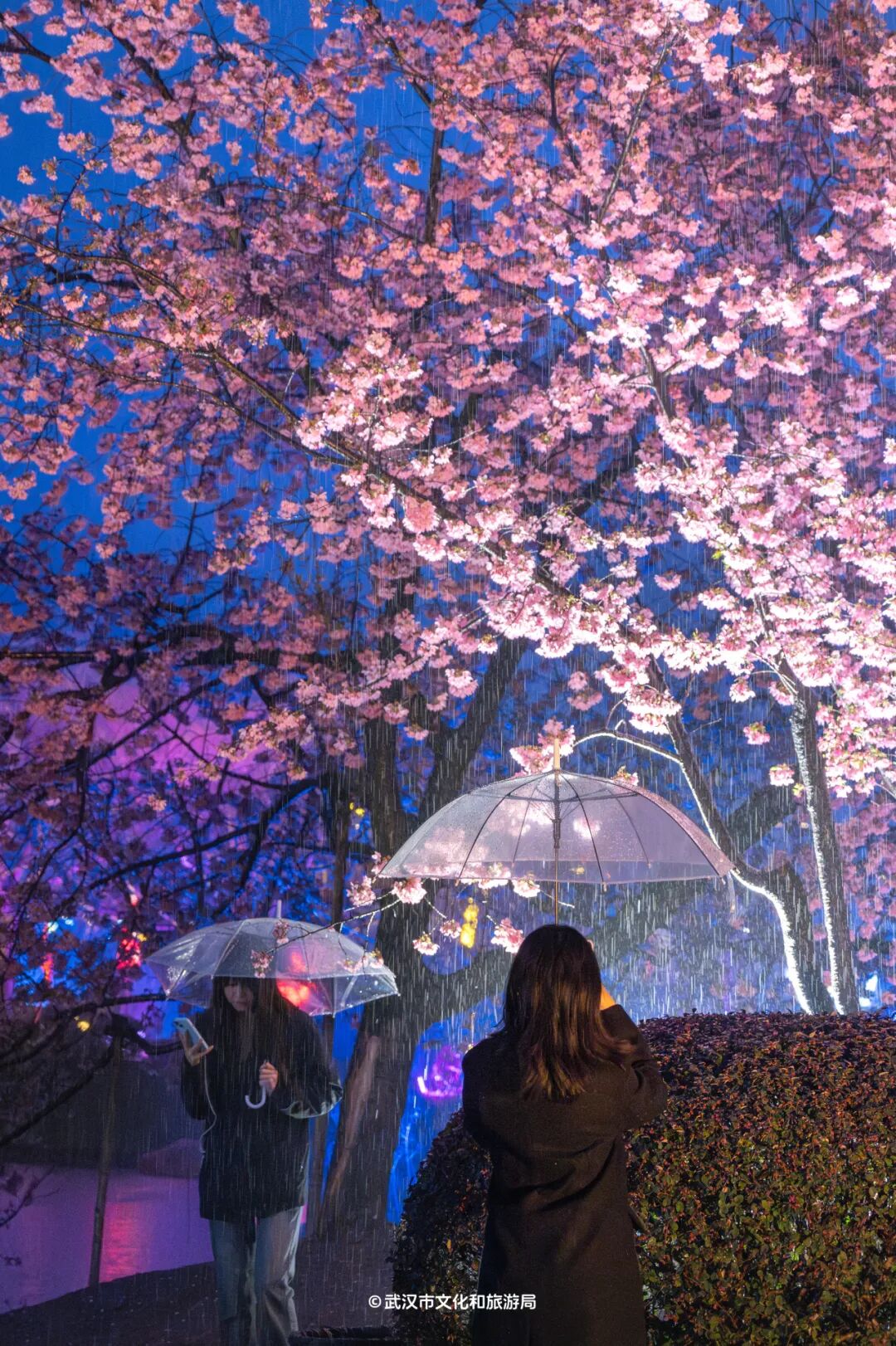 昨日细雨,东湖樱花园开放夜游,赏樱时间延长至22:00。