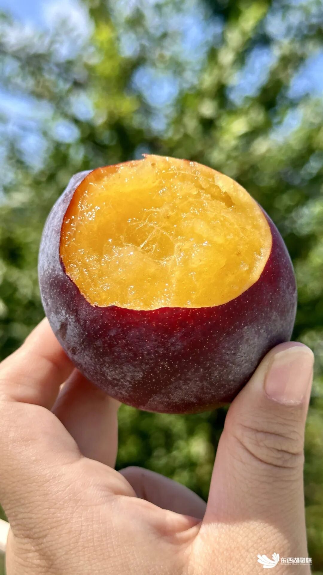 摘下一颗李子,果型硕大,表皮紫得发亮,咬下去“咔嚓”一声,酸甜比例恰到好处,果肉紧实,而核仅有拇指盖大小。