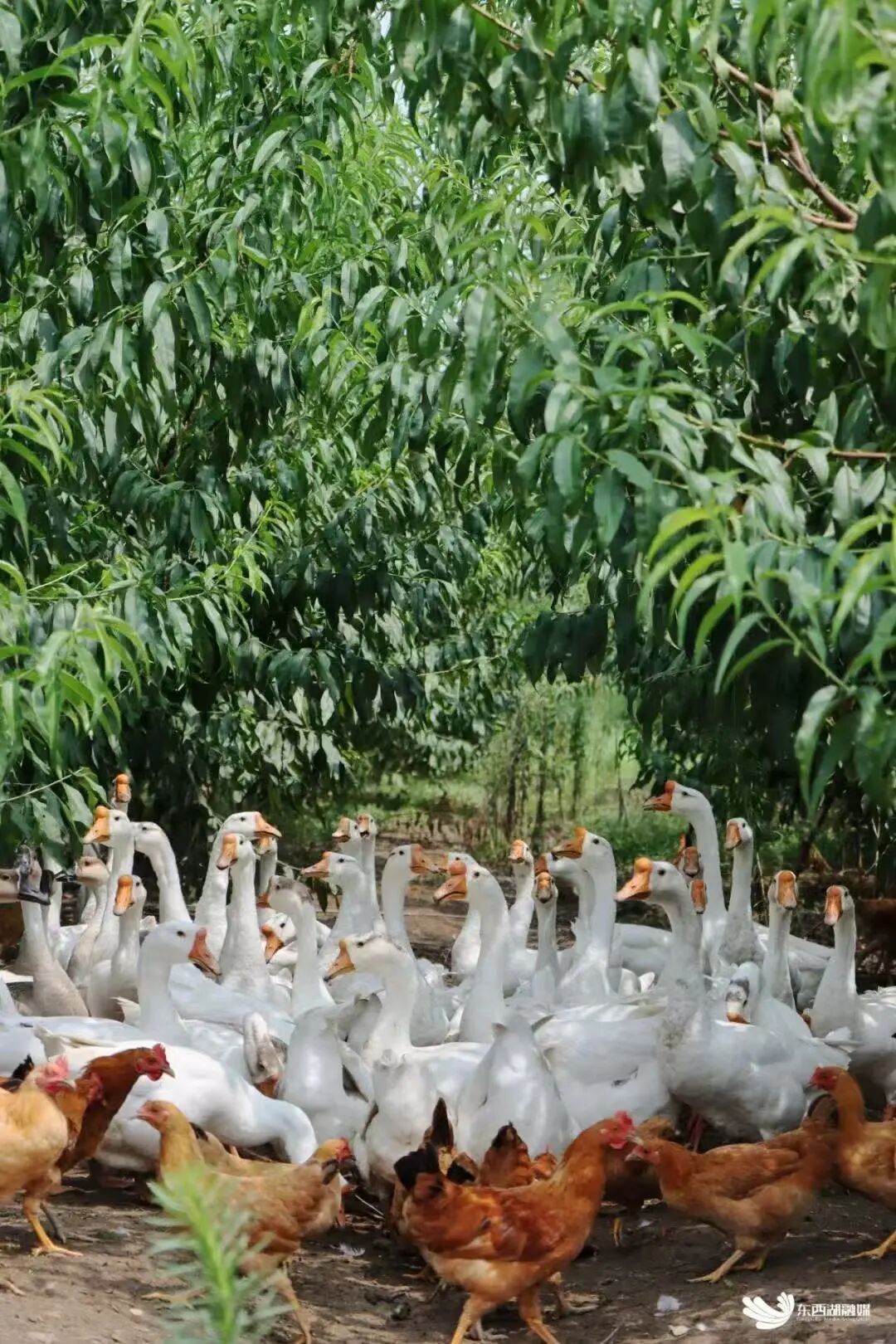 桃园里杂草错落,伴随桃树一起生长,不时还有野梨子、向日葵冒出来。一群群鸡鸭鹅悠闲地遛弯找食,地上随处可见鸡粪鸭粪。