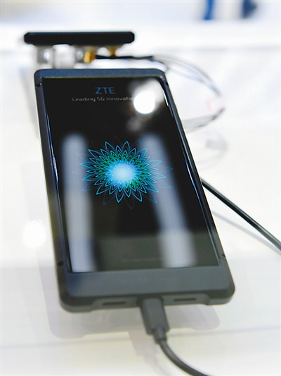 (2018世界移动通信大会上,“中国智造”成为全场一大亮点。图为大会上拍摄的中兴类5G手机。来源:新华社 郭求达 摄)