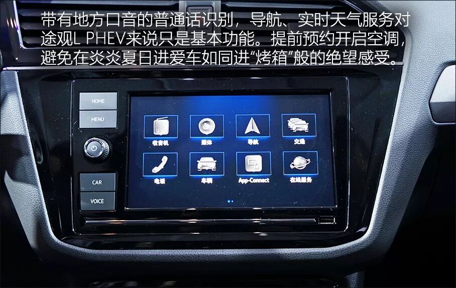 途观L PHEV搭载大众最新一代信息娱乐系统,使用科大讯飞开发语音云平台,支持带有地方口音的普通话识别,再也不会出现鸡同鸭讲的情况,还具有导航、实时天气等服务。另外,智能出行管家系统可提前预约开启空调,让你避免在炎炎夏日进爱车如同进“烤箱”般的绝望感受。