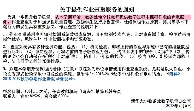 清华大学教务处教学质量办公室工作人员宣华介绍,随着大作业、小论文等课程考核方式逐渐取代单一的期末试卷考试,授课教师或助教无法完全判定学生作业是否原创,因此采用作业查重系统能有效预防和发现学术不端行为。