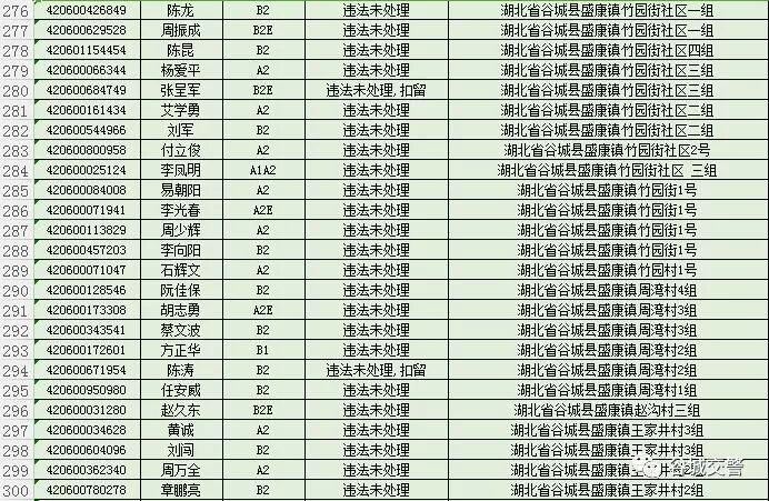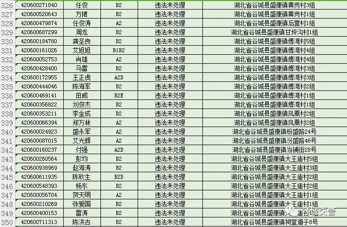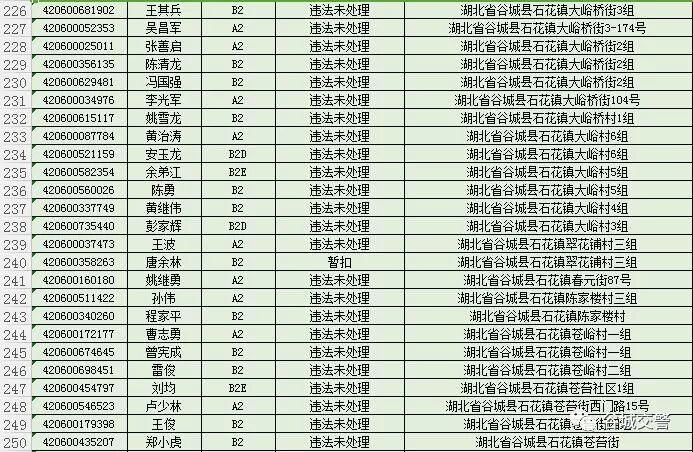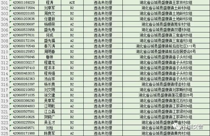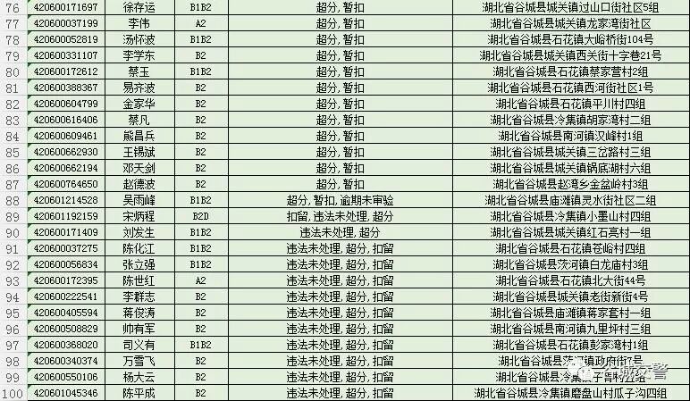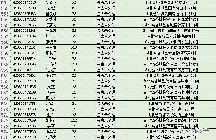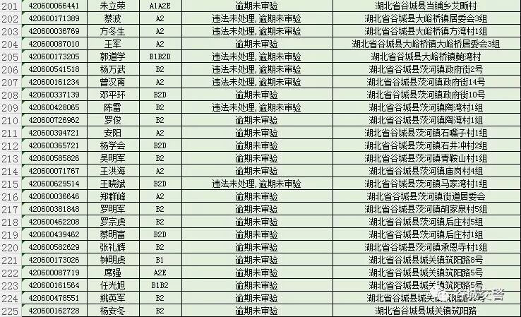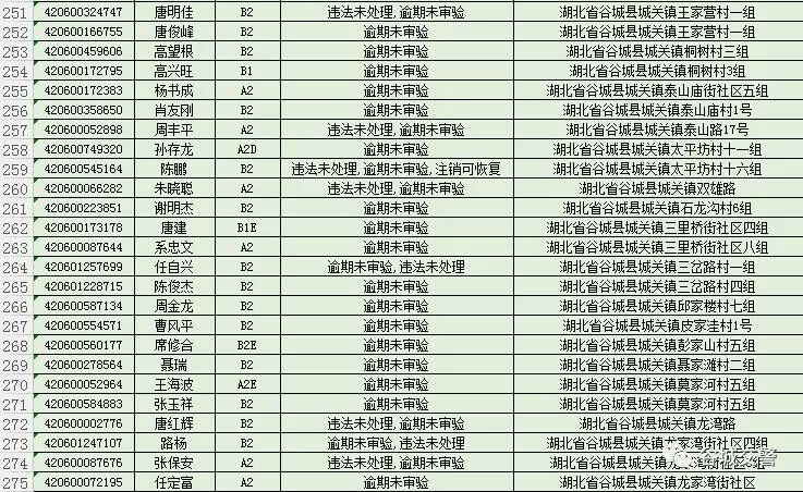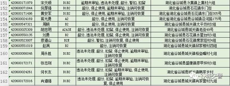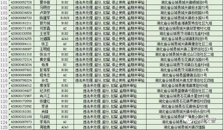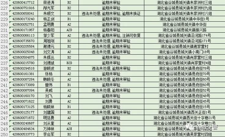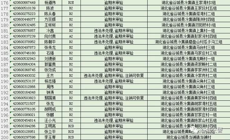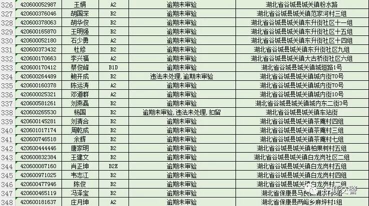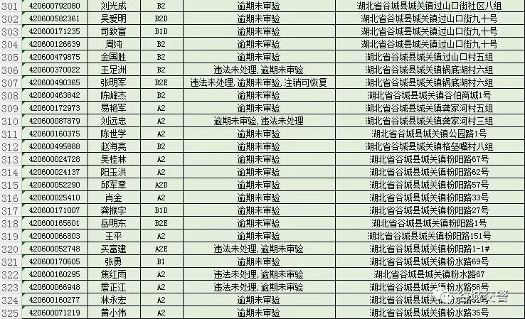 谷城县公安局交警大队温馨提示 : 以下重点驾驶人存在未换证、逾期未年审、超分、违法未处理问题,特在此进行公示,请各驾驶人及时到交警大队办理换证、审验、恢复考试、违法处理业务,避免造成驾证注销,请相互转告。 逾期未换证 逾期未审验 超分 违法未处理 (来源:谷城公安)