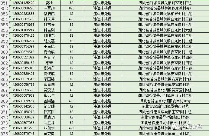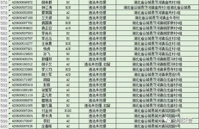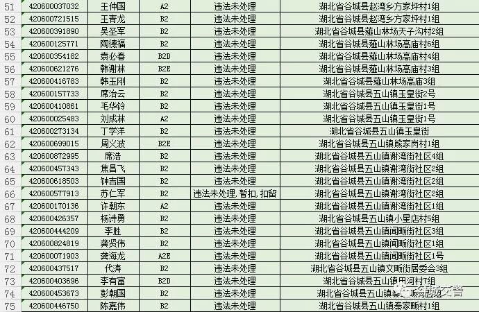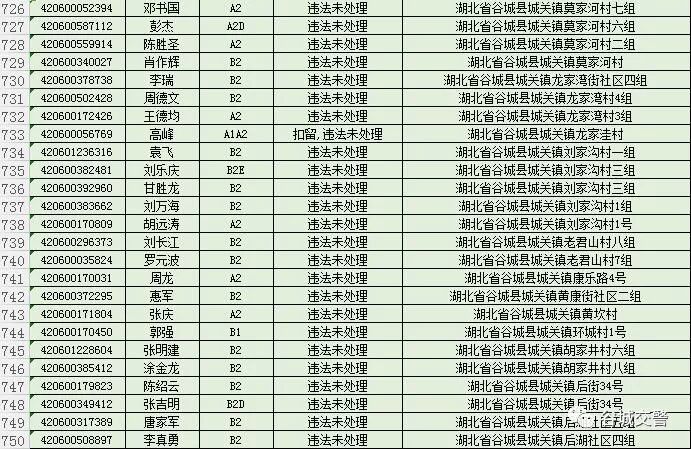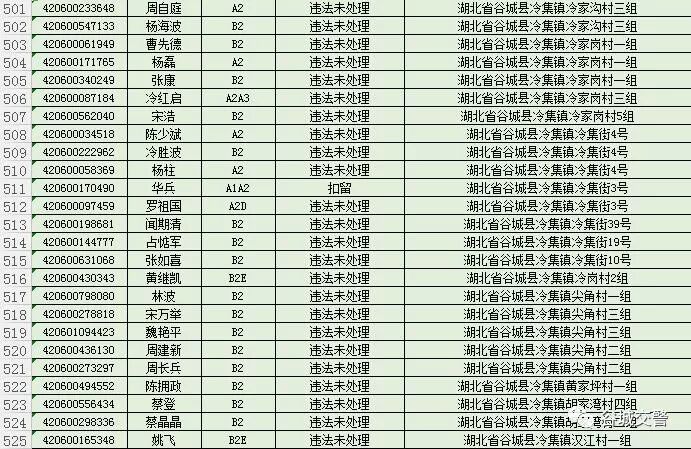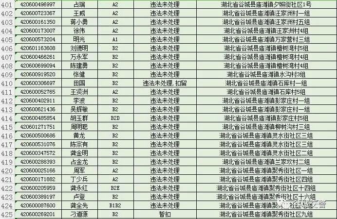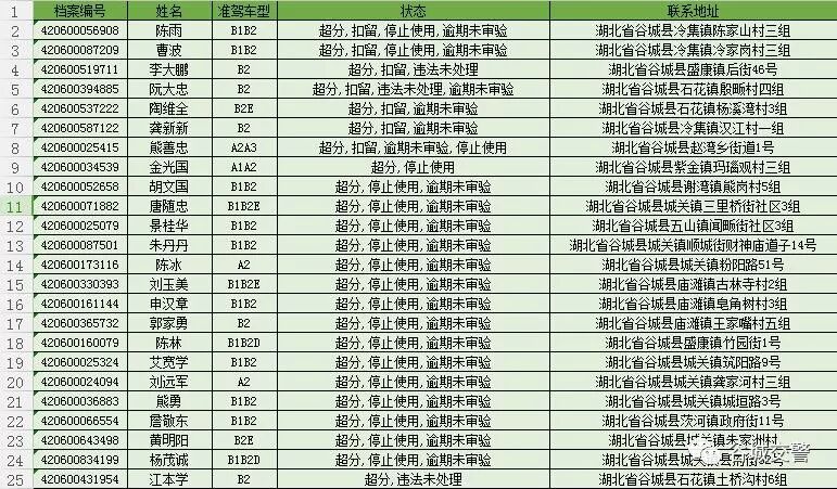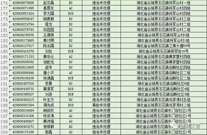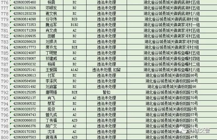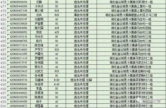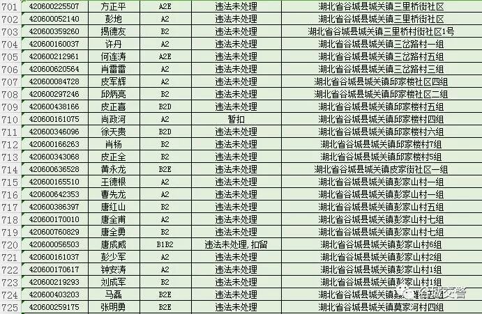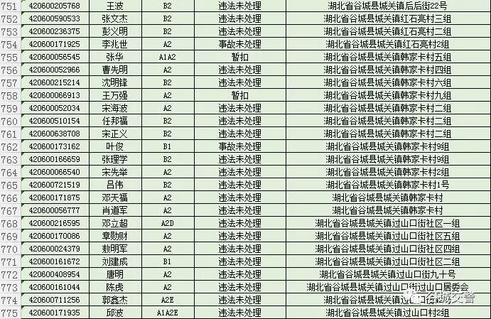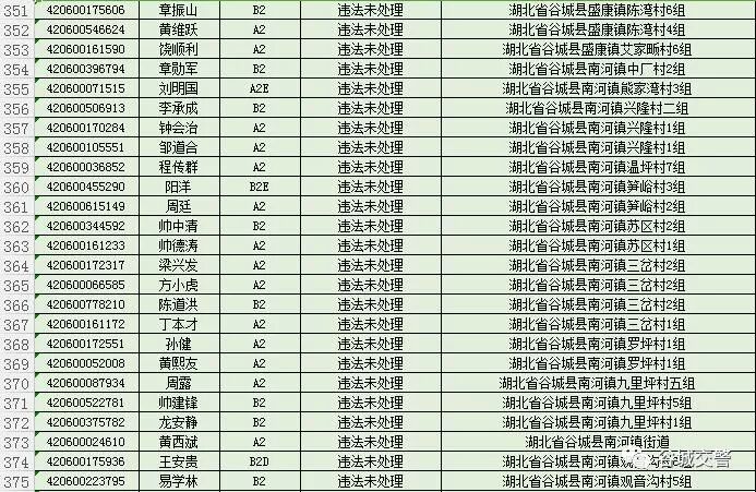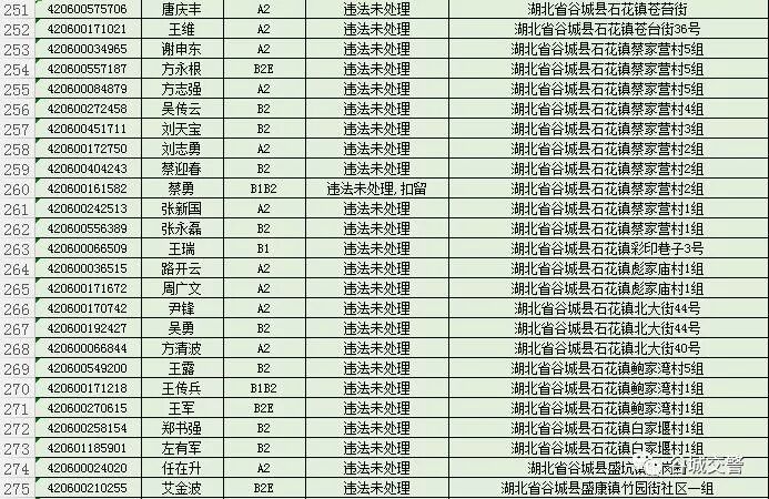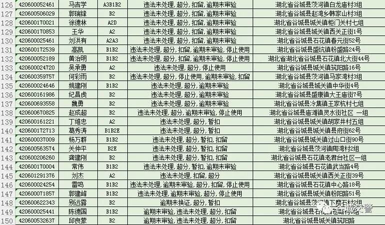 谷城县公安局交警大队温馨提示 : 以下重点驾驶人存在未换证、逾期未年审、超分、违法未处理问题,特在此进行公示,请各驾驶人及时到交警大队办理换证、审验、恢复考试、违法处理业务,避免造成驾证注销,请相互转告。 逾期未换证 逾期未审验 超分 违法未处理 (来源:谷城公安)