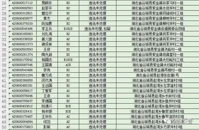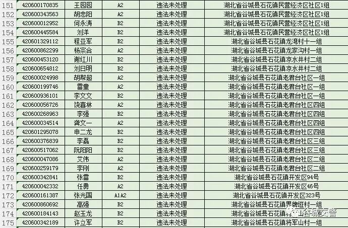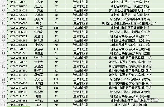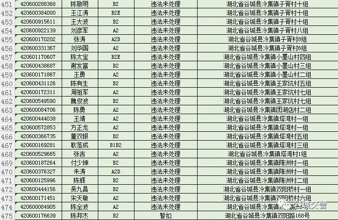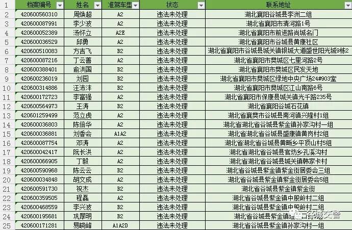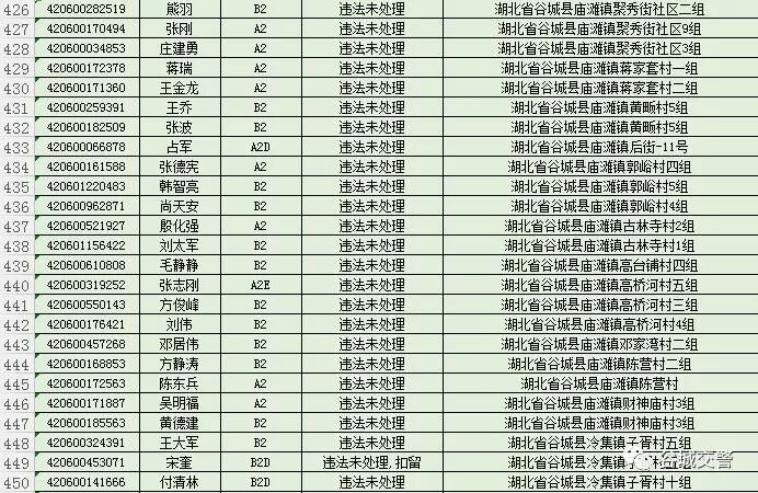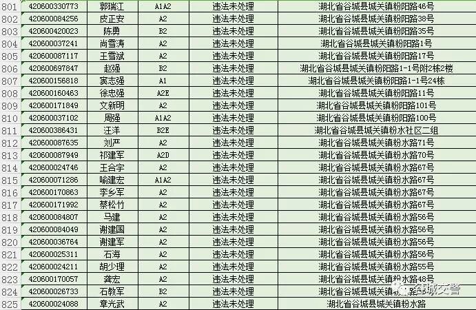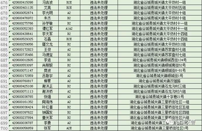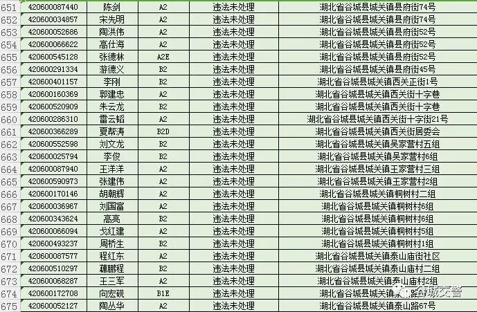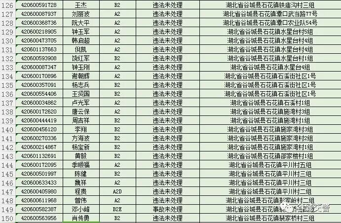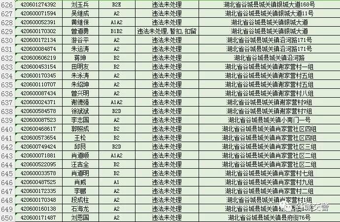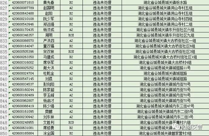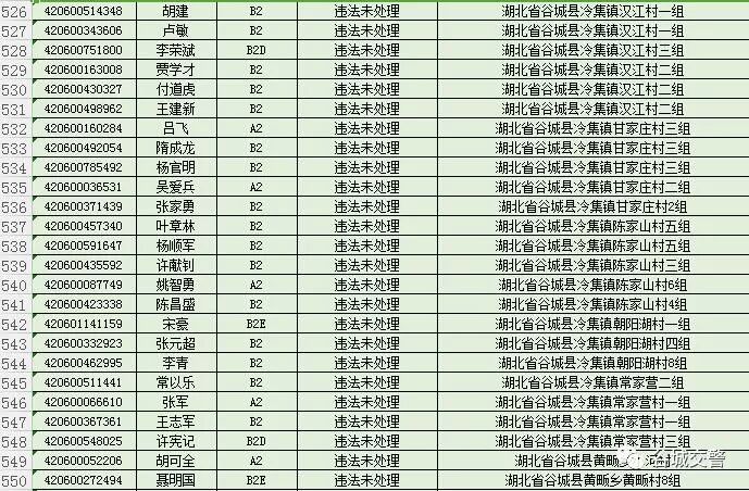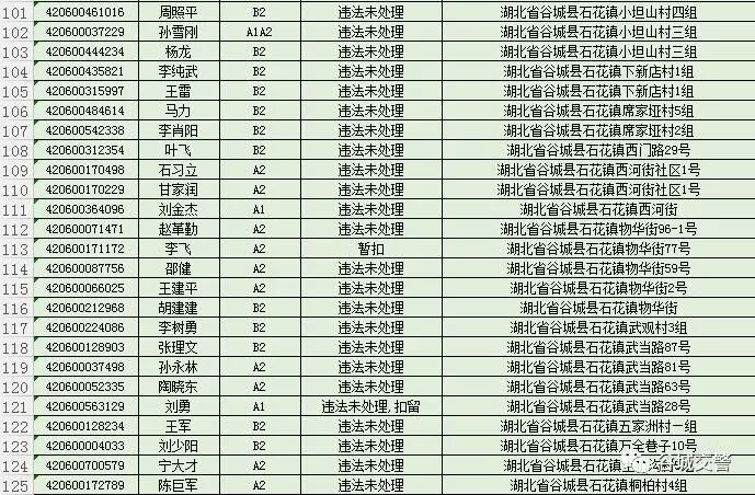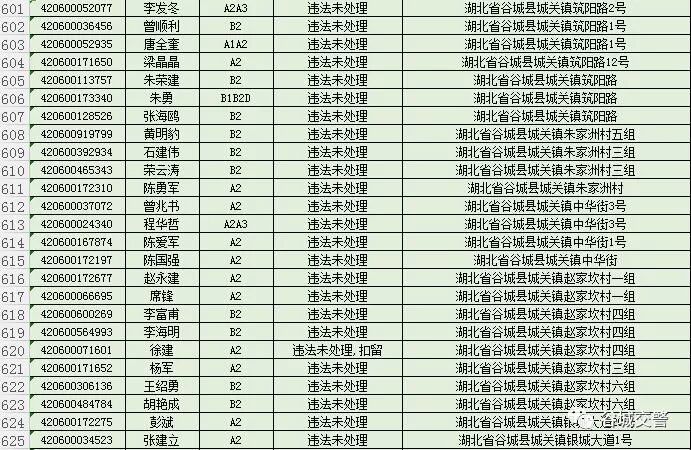 谷城县公安局交警大队温馨提示 : 以下重点驾驶人存在未换证、逾期未年审、超分、违法未处理问题,特在此进行公示,请各驾驶人及时到交警大队办理换证、审验、恢复考试、违法处理业务,避免造成驾证注销,请相互转告。 逾期未换证 逾期未审验 超分 违法未处理 (来源:谷城公安)